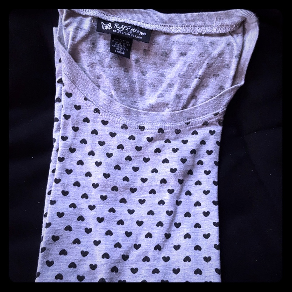 Gray short sleeve top with black hearts all around.