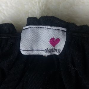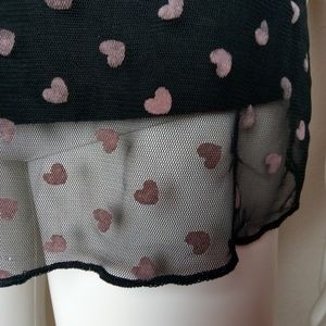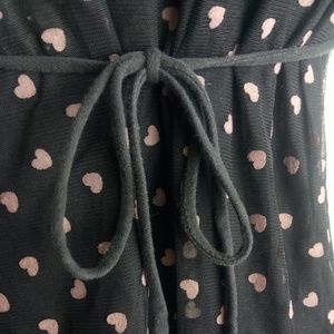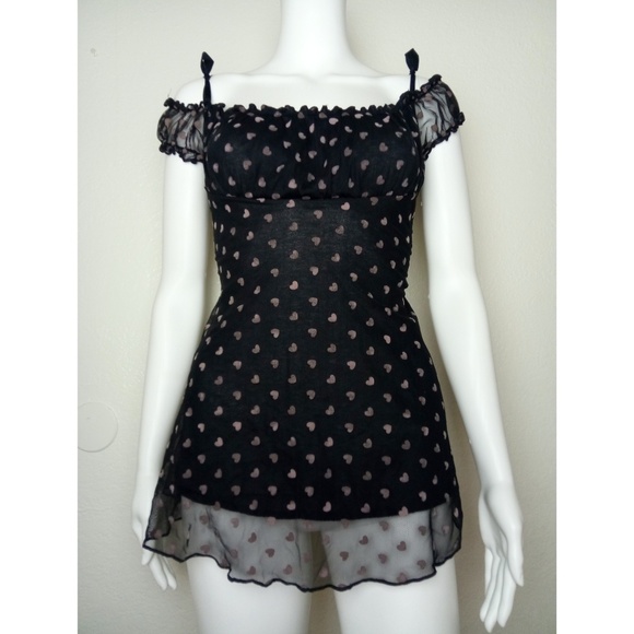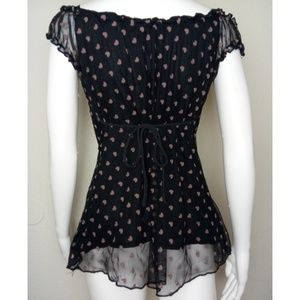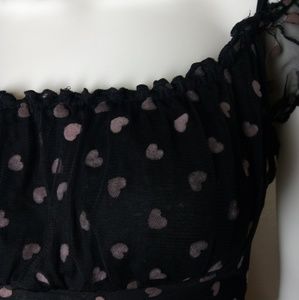 The cutest sheer blouse ever, with off the shoulder sleeves and bow tie straps. Features a heart pattern all over and a string around the waist to tighten. It's truly gorgeous, and in great condition.