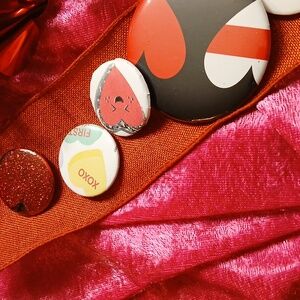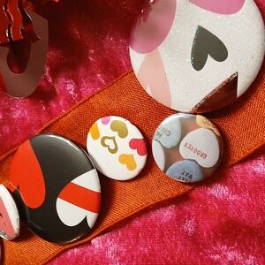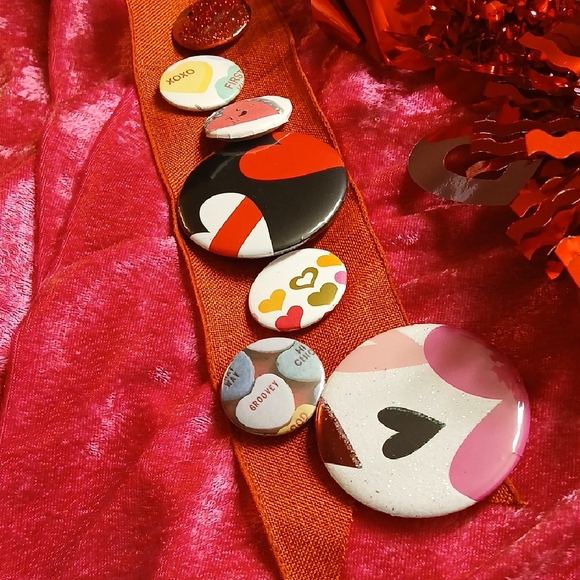 Add a playful touch to your outfit with this heart patterned button set. Featuring vibrant colors, these buttons are perfect for accessorizing bags, jackets, and more.