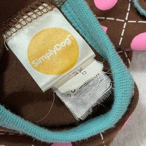 Adorable dog dress with pink heart pattern and blue trim. Perfect for small pets. Measurements are pictured.