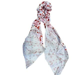 Silky hair scrunchie with a heart pattern. Features red and pink hearts on a white background.
