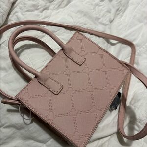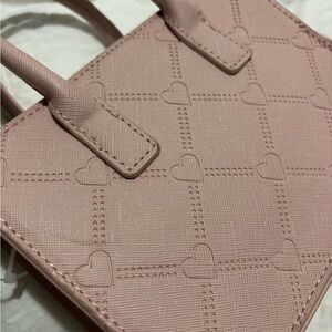 Chic and stylish, this pink handbag features a charming heart pattern. Perfect for adding a touch of elegance to any outfit.