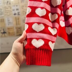 Stay cozy and stylish with this heart-patterned red sweater. Perfect for adding a touch of love to your wardrobe. This is a thick warm sweater that is Is such great quality and in Perfect condition!