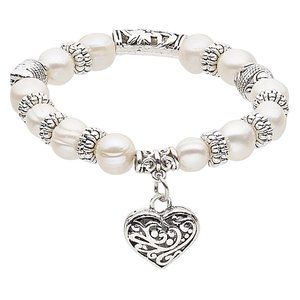 Natural pearl bracelet features a heart charm and is stretchable.