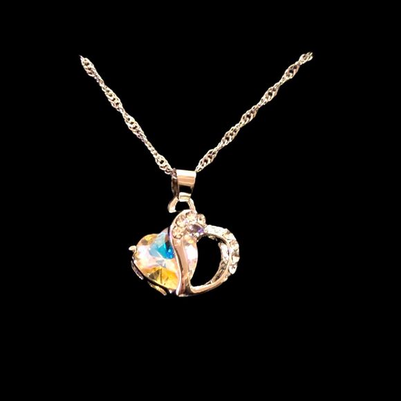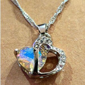 Elegant heart-shaped pendant with a sparkling iridescent crystal set in a silver-tone heart frame accented by clear rhinestones. The 17-inch 925 sterling silver chain adds timeless shine, making this piece perfect for everyday wear or as a thoughtful gift.
