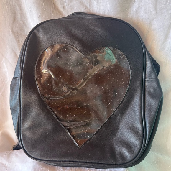 Backpack with glittery clear window for pins or whatever you’d like to display, lots of room inside