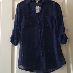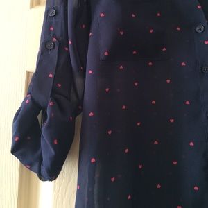 Feminine twist on the classic button down. Chiffon with cute heart print. Roll up sleeves and 2 front pockets. Perfect for that office causal environment! Never been worn!!