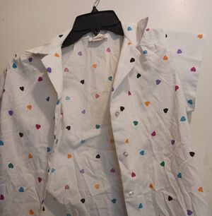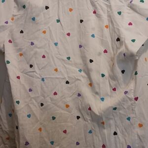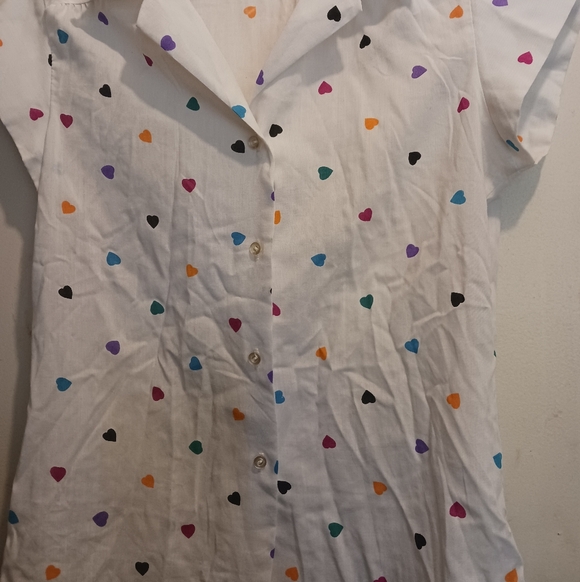 Lightweight white button-up shirt with multicolored hearts. size tag is missing but appears to be small.