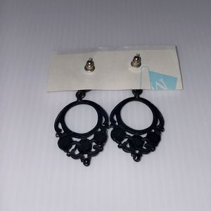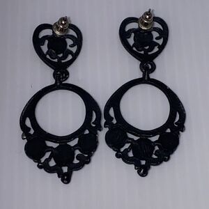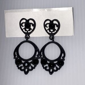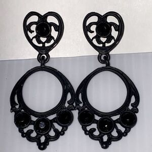Heart Shape Drop Dangle Earrings In Black With Black Stone Embellishments