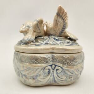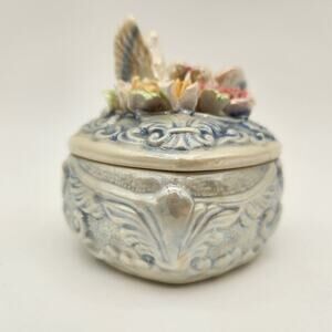 This jewel box has so much beauty going for it: the lusterware blue iridescent finish on the box itself, the carefully crafted flowers, the beautiful birds caught in mid kiss - it really is a special piece!