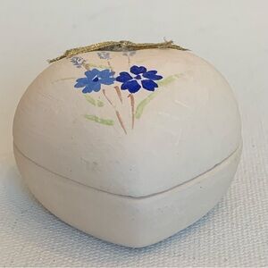 Heart Shaped Bisque Porcelain Trinket Box Blue Flowers Gold Bow on Lid Vintage 2"x2".