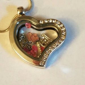This silver toned, heart shaped locket is highlighted with crystal colored rhinestones on one side. Inside it contains pink rhinestones and princess charms. Comes with a matching silver chain.