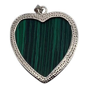 This elegant heart-shaped pendant features a green malachite stone adorned with a delicate silver rose design, ideal for adding sophistication to any outfit.