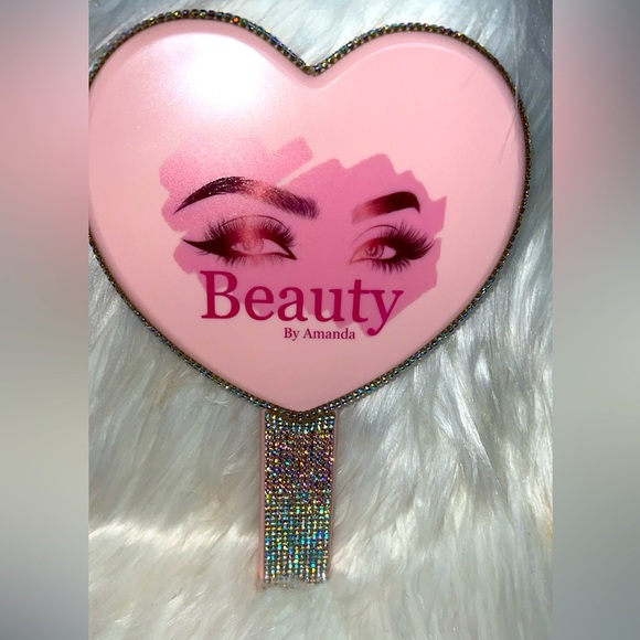 Hand Held Heart Shaped Pink Mirror With Rhinestones U Can Put In Your Purse.. HMU on IG BeautyyByyAmanda