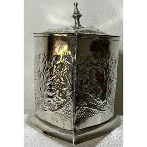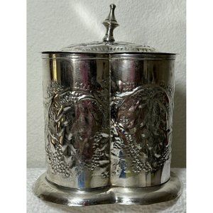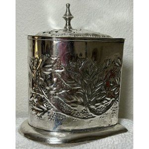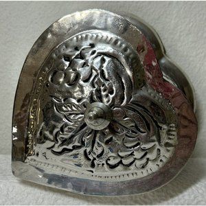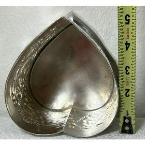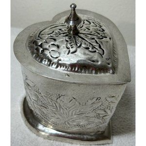 Heart Shaped Repousse Tea Caddy/trinket Box With Finial Epns Made In India Vtg. Beautifully made hammered silver plated heart shaped caddy. Grapes & leaves design is very cool !!