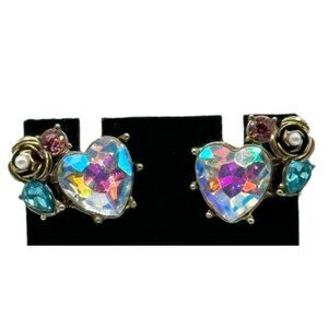 Heart Shaped Rhinestone Gold Tone Floral Stud Earrings With Iridescent Crystal