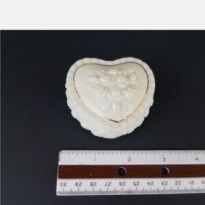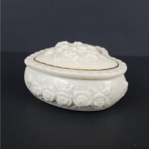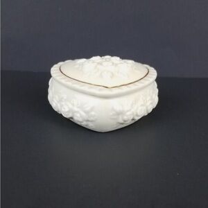 Heart Shaped Small Porcelain Trinket Box Ivory w/ Gold Trim Embossed Roses 2.75"