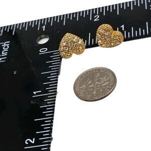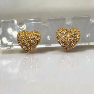 Heart Shaped Studs Earrings Clustered Clear Rhinestones Raised Surface Gold Tone.