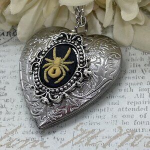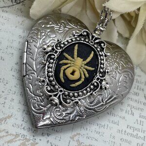 Heart Silver Locket Gothic Necklace Photo SPIDER Gothic Black Widow Cameo Witch
