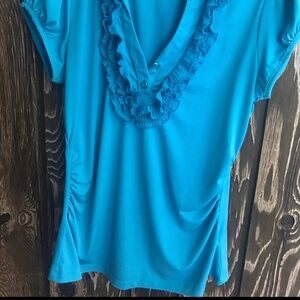 Very pretty stretchy polyester top by heart snd soul. In EUC blue with ruffle nevk size ZL juniors