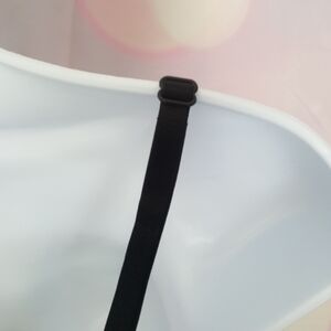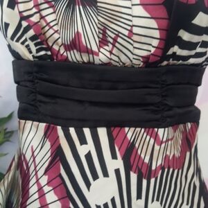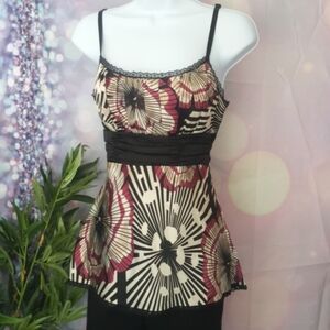 Beautiful top with adjustable spaghetti strap. The back ties for tightness , beautiful lace around the bust area. Purple and black graphic design. Silky feeling. 100% polyester. The bust area is double lined.