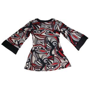 Keywords: Heart & Soul, top, multi-color, swirl, abstract, geometric, paisley, black, red, white, gray, v-neck, faux-wrap, 3/4 sleeve, flared sleeve, bell sleeve, polyester, spandex, stretchy, casual, everyday, dressy casual, workwear, fall, winter, M, Style 2506IA144