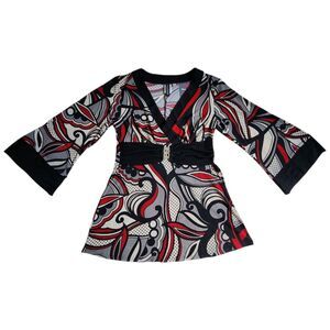 Brand: Heart & Soul. Occasion: Casual, Everyday, Dressy Casual, Workwear, Fall, Winter. Size Type: Regular. Size (Women's): M. Material: 95% POLYESTER, 5% SPANDEX. Neckline: V-Neck, Faux-Wrap. Style: Top, Style# 2506IA144. Sleeve Length: 3/4 Sleeve, Flared Sleeve/Bell Sleeve. Color: Black, Red, White, Gray. Pattern: Swirl, Abstract, Geometric, Paisley-inspired. Features: Stretchy fabric, Faux-wrap bodice with buckle detail, Empire waist/Ruched waist.