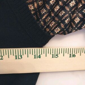 The Heart Soul Women's Top in size small is a dark academia whimsigoth preppy maximalist whimsy blouse featuring a geometric pattern with a collared neckline and long sleeves. Made of polyester and acrylic knit fabric, this cropped top has a button closure and a casual sleeve type. It is perfect for those who enjoy 70's inspired retro fashion with a touch of whimsical style. Easy to care for and lightweight, this blouse is a versatile addition to any woman's wardrobe. It's 1/2 sweater & 1/2 button down top.
