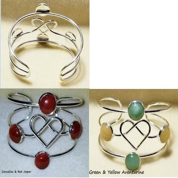 I made these bracelets with silver plated cuff blanks and added 13mm cabochons. Your choices are: Green & Yellow Aventurine, and Carnelian & Red Jasper.