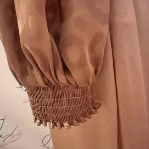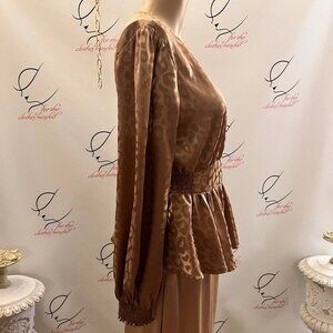 Heart Threads? Not sure of the brand name. Size Medium. Peplum Pullover Blouse. Elastic wrist back. Shoulder to hem 23". Sleeve 24" with elastic at wrist. Bust 18/36". Poly spandex. Hand wash. Elastic in back at waist - insert in front.