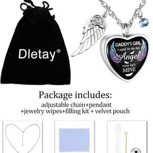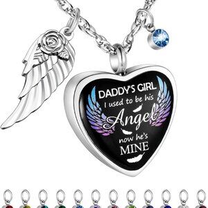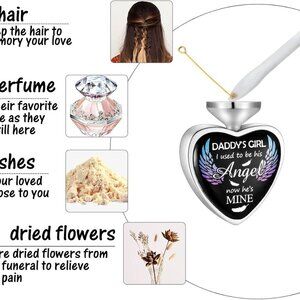 IDEAL GIFT: Comes with a beautiful velvet pouch. This urn necklace is engraved Daddy s girl, I used to be his angel, but now he s mine. Ready for gift giving and make the best impression! Also comes with a set of filling kit for you to fill the memories in.