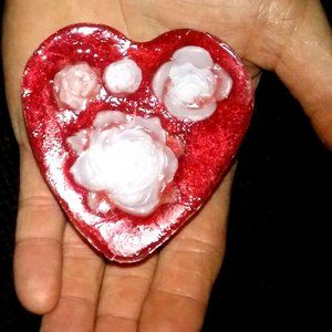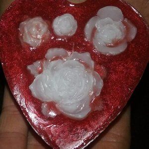 This soap bar was made by hand, by me. All of the ingredients are natural. This bar was made with a glycerin soap base, colored with mica, and scented with essential oils. The oils used were clary sage, basil, and bergamot. They make for a scent that is very pleasing to the nostrils. Aromatherapy.......Heyyy!!! It also aids in moisturizing skin. I sell many items at vendor/craft shows. This is a favorite seasonal item. I will temporarily discontinue the item after Feb. 7th of 2022 until a few weeks before Mother's Day of 2022. I don't have these camera. Please forgive the photos. They are more attractive in person. Red heart shaped soap with white rose embeds.