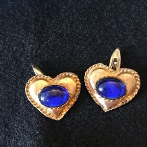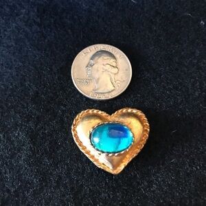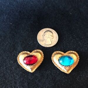4 heart buttons measure 1 inch wide and almost 1 inch tall. All gold background. 1 red ❤️, 1 turquoise heart and two blue hearts. These would be a great addition to a shirt or jacket!