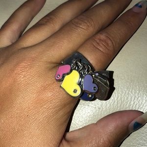 Multicolored hearts dangling from form fitting silver ring.