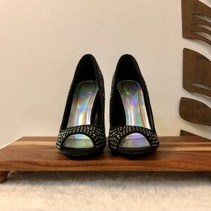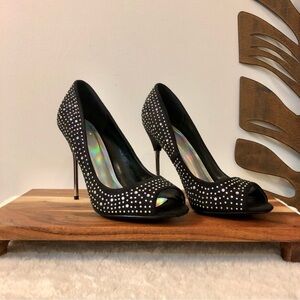Excellent condition black faux suede heels with rhinestone accents. Silvertone stiletto heel that measures 5 inches (see pic). Peep toe to show off that pedicure! Right shoe is missing the logo on the footbed but can’t be felt, purely aesthetic. Size 10.