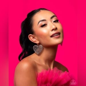 A shiny, oversized silver heart is filled with swirls of filigree, emitting vintage whimsy as it swings from the ear. Earring attaches to a standard fishhook fitting.