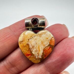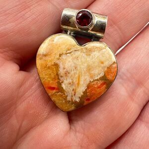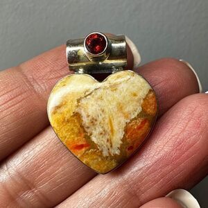 Heart shaped coral jasper and spessartite garnet in solid 925 pendant/slide!