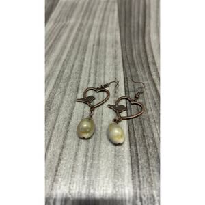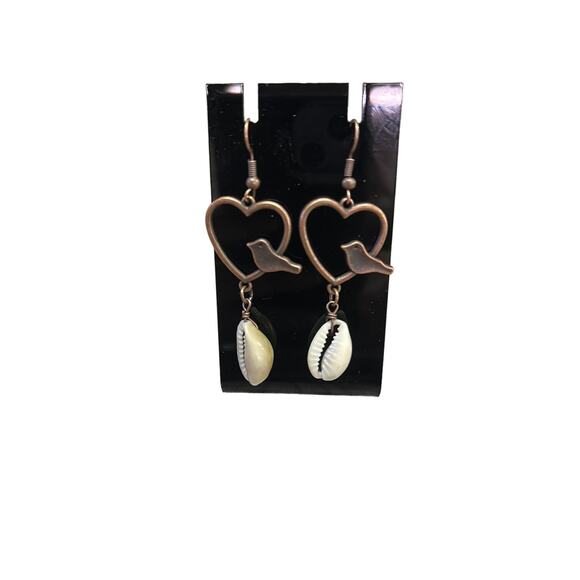 Heart with bird seashells copper tone earrings. About 2” Light weight