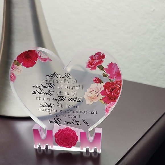 Heart-shaped acrylic figurine with Carnation Design. A collectible decorative plaque for Mom. Features the word 'Mom' and a heartfelt message.
