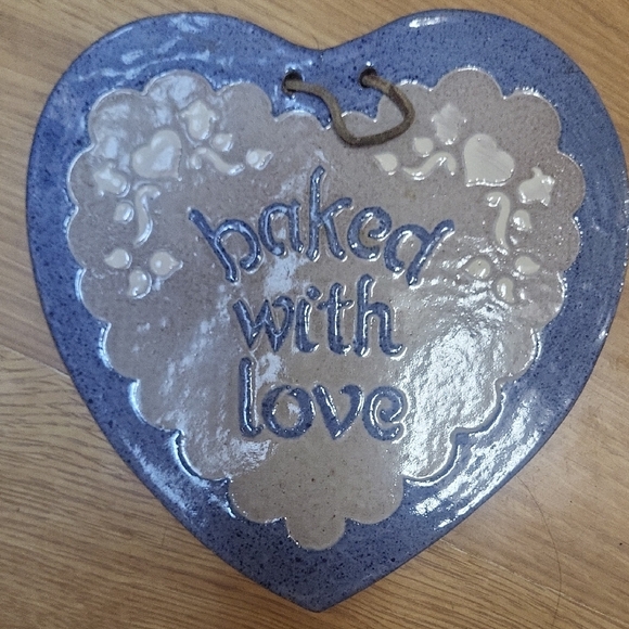 Heart-shaped plaque with 'baked with love' inscription. Features blue and cream colors.