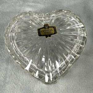 Heart-Shaped Crystal Zajecar 24% Lead Glass Trinket Box Made In Yugoslavia. Still has label on the item, but is shows some signs of wear due to age.