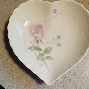 Elegant heart-shaped porcelain dish featuring a delicate pink rose design. Perfect for adding a touch of charm to your dining experience.