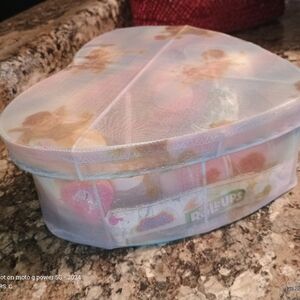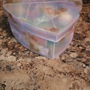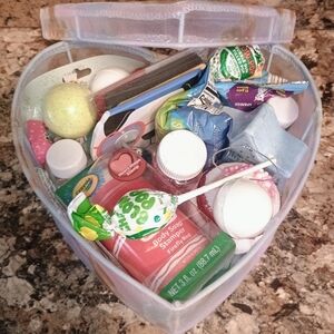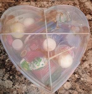 Heart-shaped mesh organizer with a white and purple design. Perfect for storing small items. super cute reusable heart shaped basket with lid. this child's gift basket is custom for any occasion. travel rides overnight hotel stays birthdays and more has fruit Roll-Ups blowpop multiple bubbles Nutri-Grain bars multiple bath bombs various shapes sizes Crayola body soaps with sponge stamper magnets and activity sets and candy