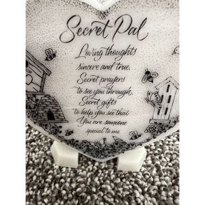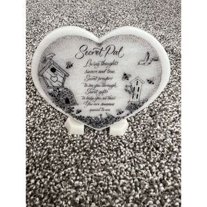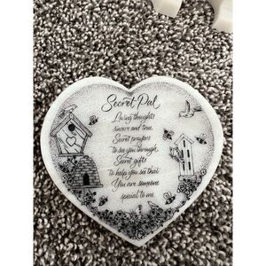 A heart-shaped plaque featuring a sentimental poem and decorative illustrations of birds and butterflies. It appears to be made of a ceramic or resin material, designed to be a thoughtful gift for a 'Secret Pal'.