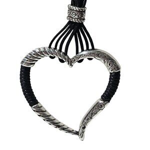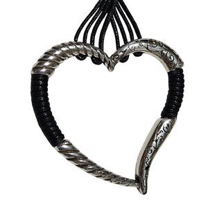 This heart-shaped necklace features a silver pendant and multi-strand black cord, offering a chic and versatile accessory for any outfit.