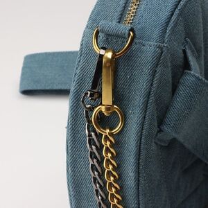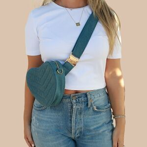 Heart shaped Bag comes with 3 straps. An adjustable denim cross body/belt bag strap and pewter and gold chain strap. Made with sustainable denim fabric. This bag fits across your body ready to be worn from day to night. Easy access to all your necessities Adjustable strap to wear multiple ways and tighten for a close or loose fit. Straps are detachable and adjustable to fit your body the way you want. Also this bag is just so cool. Right?