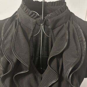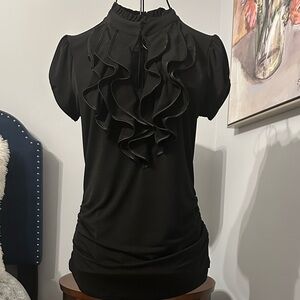 Chic black blouse with elegant ruffles. Perfect for stylish occasions.