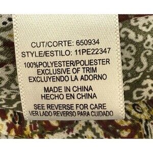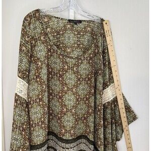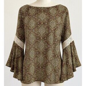 Features a vintage-inspired medallion print in olive, gold, and burgundy with crochet lace trim on dramatic bell sleeves. Lightweight flowy fabricperfect with jeans or leggings for a casual or dressy look.