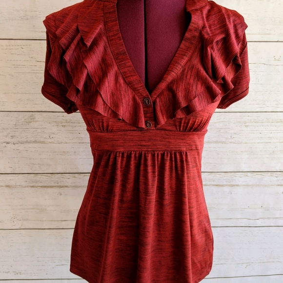 Red v-neck top with layered ruffles; cinched waist; puff sleeve; two strings that tie in back; flows nicely and has smooth feel; stretchy polyester