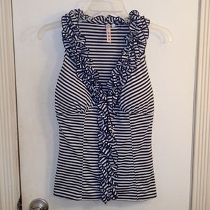 HeartSoul brand tank, ruffle around neck and down middle of shirt, navy and white stripes, thin padding in cup area. Looks very nice and nautical with white pants or shorts or with navy shorts. New with tags, no flaws. I am happy to receive offers and will most likely accept if they are reasonable. Bundle multiple items for a discounted offer!